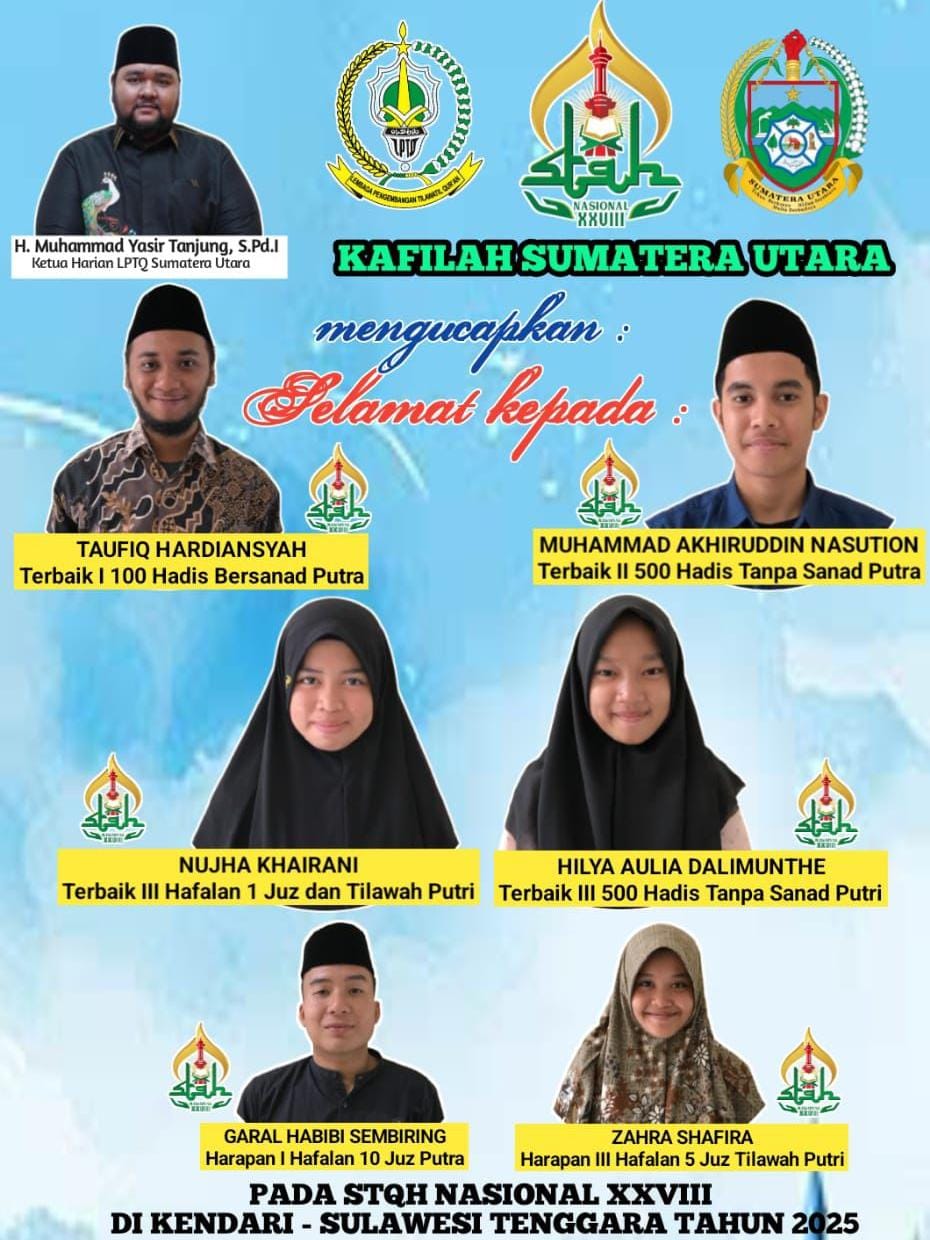 Ustadz H. Muhammad Yasir Tanjung, S.Pd.I sebagai Ketua Harian LPTQ Sumatera Utara dan Pimpinan Kafilah didampingi Drs. H. Burhanuddin Damanik, MA, Prof. Dr. H. Azhari Akmal Tarigan, M.Ag., dan H. Damri Tambunan, M.Pd. mengucapkan rasa syukur atas prestasi ini dan memberikan apresiasi yang setinggi-tingginya kepada peserta yang telah membawa nama harum Provinsi Sumatera Utara pada STQH Nasional XXVIII Tahun 2025.